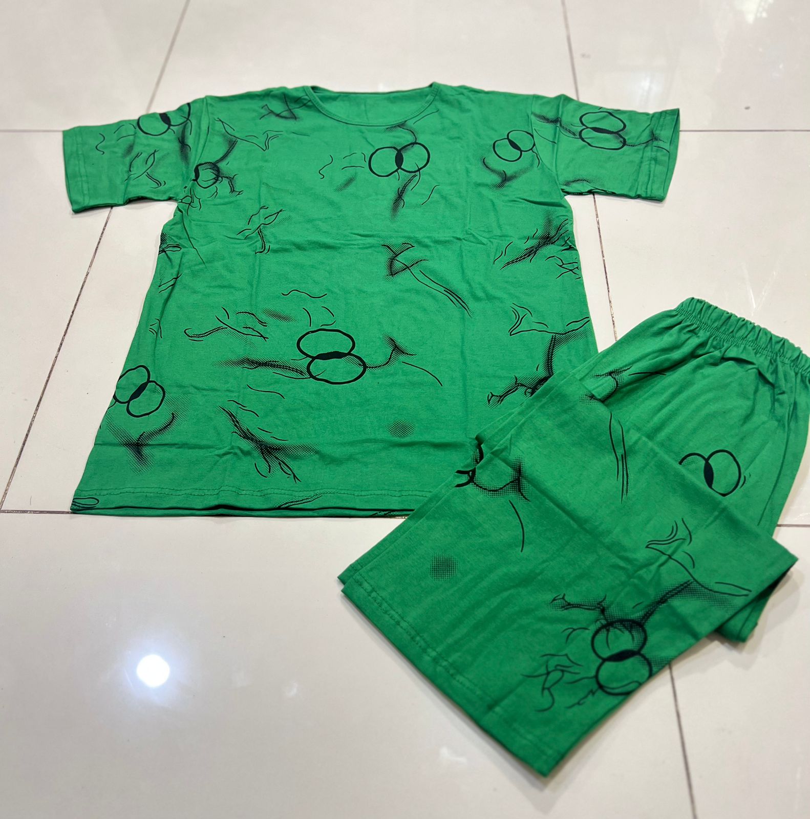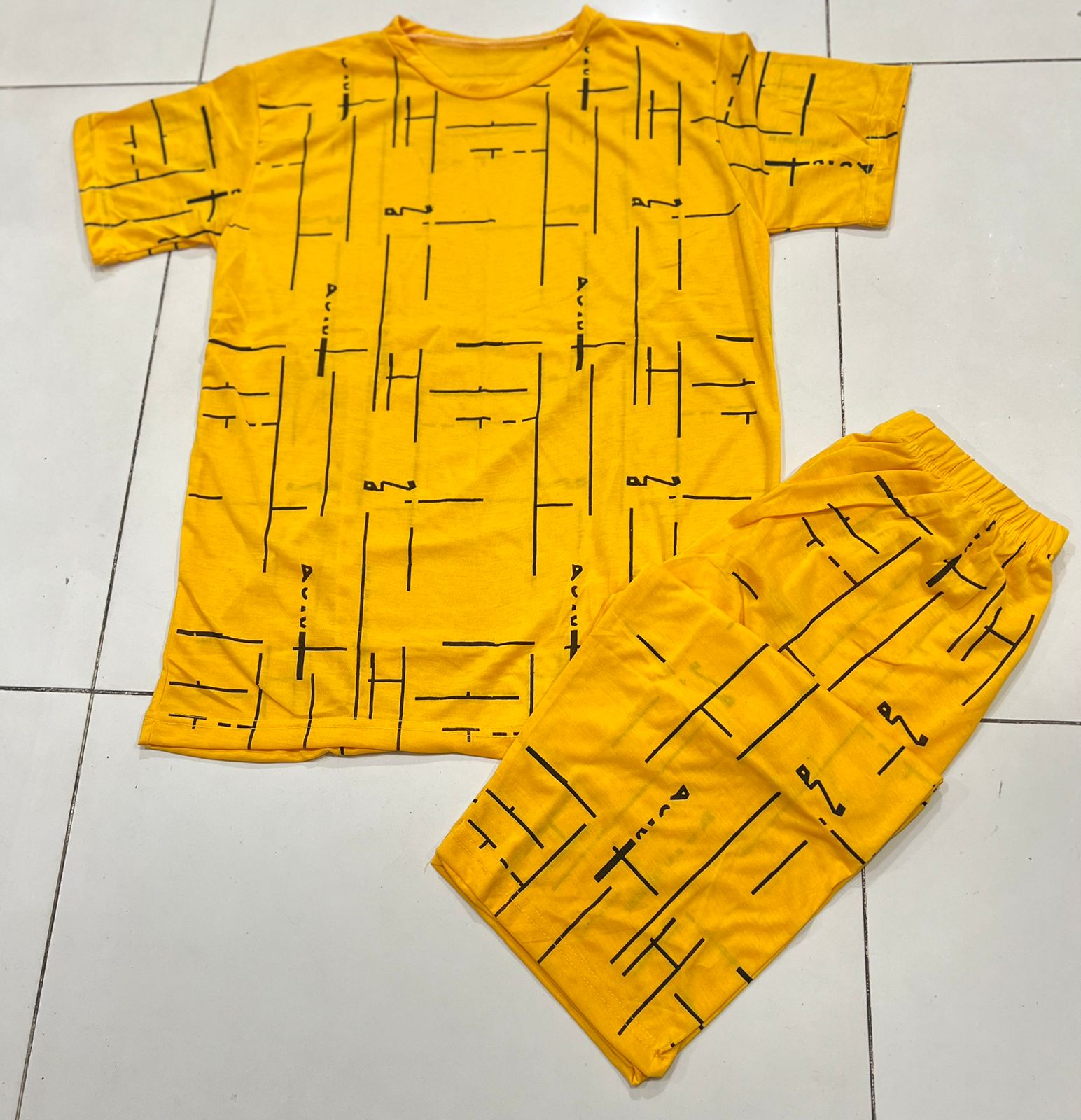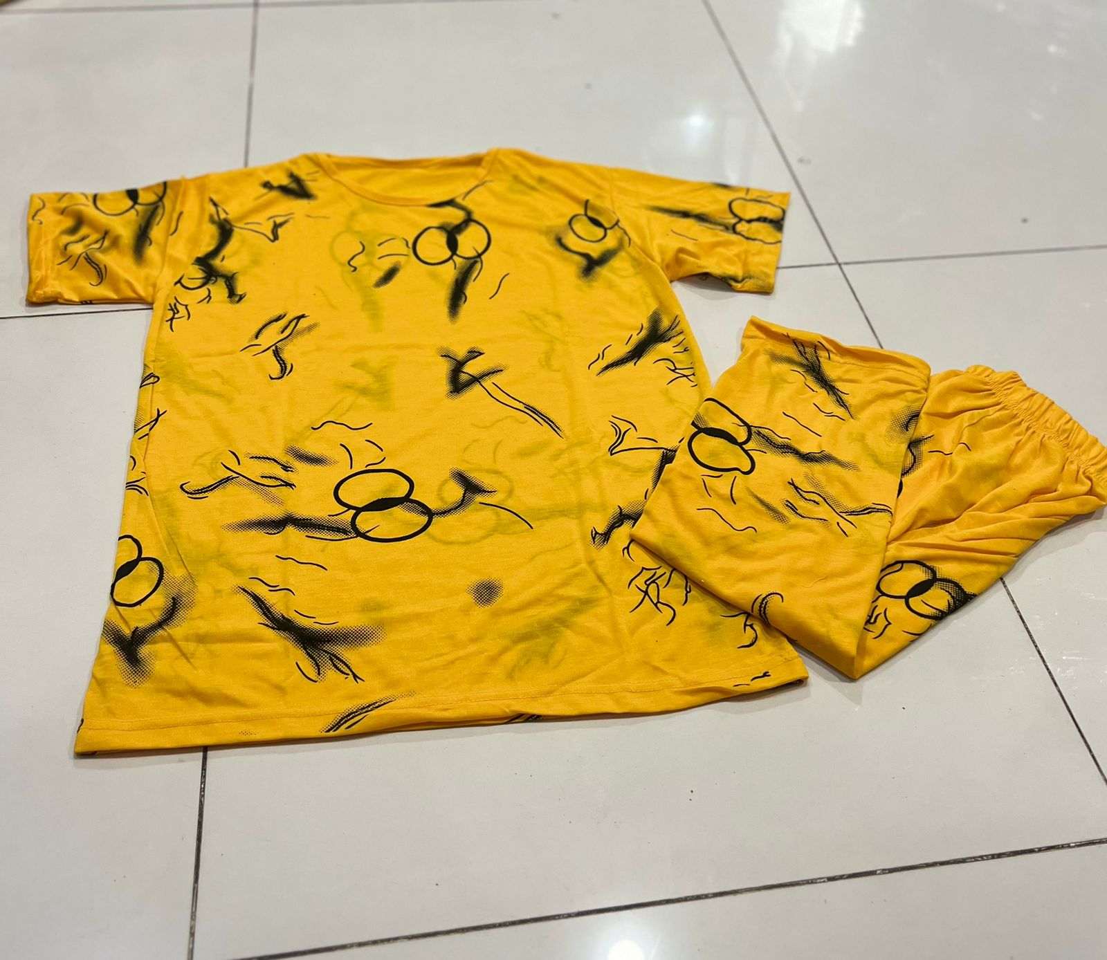 Make a bold style statement with this chic and artistic two-piece set. Featuring a vibrant mustard yellow base with a unique black abstract circle print, this outfit is perfect for a stylish day out or comfortable lounging. The breathable, lightweight fabric is ideal for Karachi's climate. The set includes a relaxed-fit, short-sleeve top and trendy wide-leg capri pants, offering a comfortable yet fashionable silhouette.